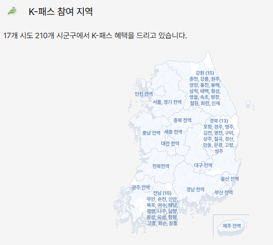 K-패스를 이용하면 최소 20%에서 최대 53%까지 대중교통 요금을 할인받을 수 있으며, 서울과 경기도를 포함한 전국 17개 시도, 210개 시군구에서 혜택을 받을 수 있는데요.